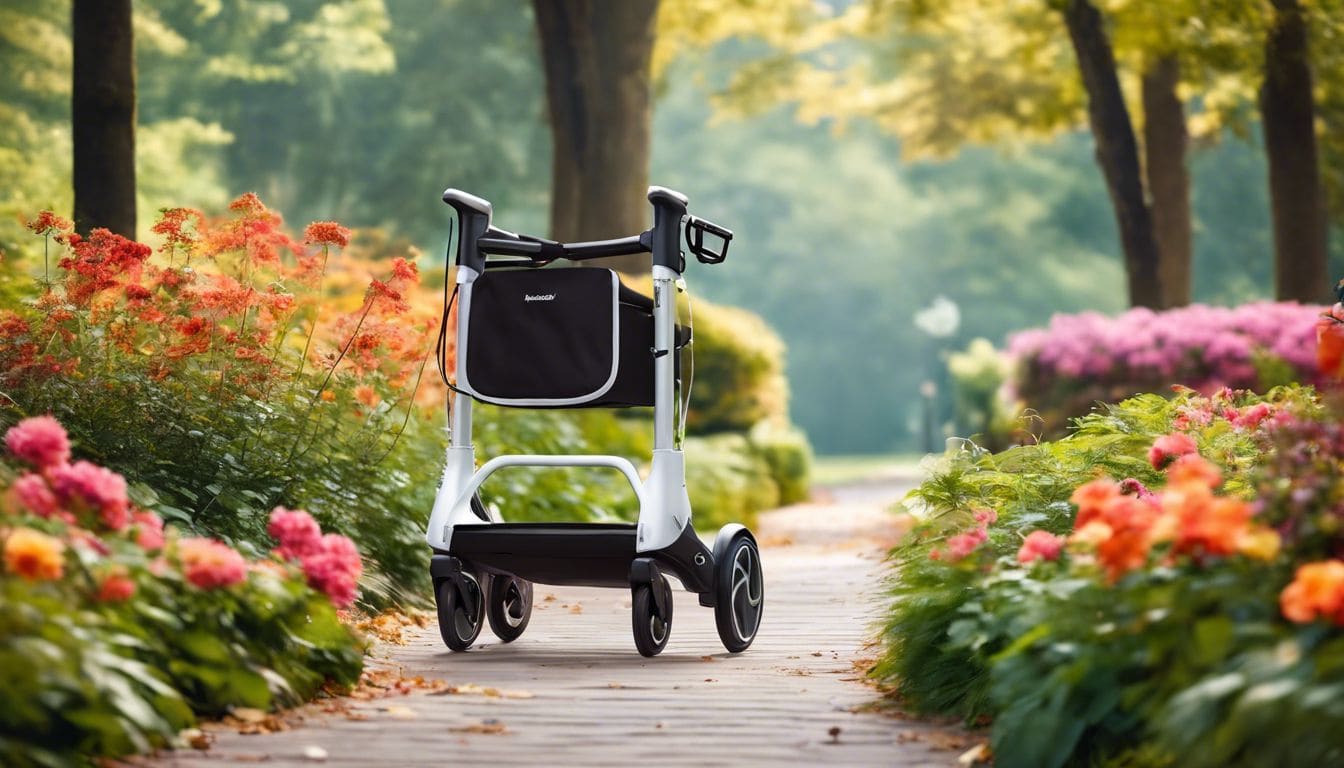 elektrische opvouwbare rollator .” title=”Een oudere persoon geniet van een rustige wandeling in het park met een elektrische opvouwbare rollator.” class=”awimage” />